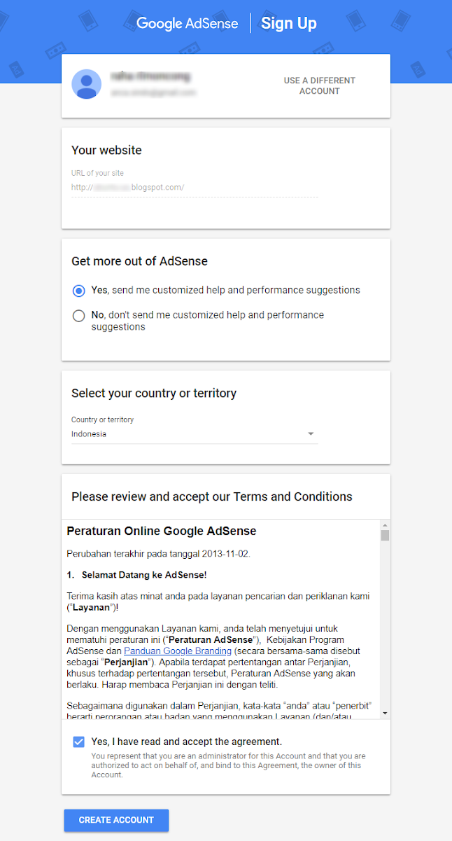Tahap selanjutnya, pilih di negara mana kalian berada. Tentulah Indonesia. Maka peraturan online Google Adsense yang muncul dibawahnya akan berubah berbahasa Indonesia. Silahkan baca kalau punya waktu. Pada intinya itu aturan mengikat agar bisa menjalin kerjasama dengan Adsense.
